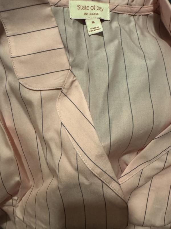 Adorable pajama set! I love the light pink color and the pinstripe detail on the pajamas. The top is a peplum style, which makes it different than any other nighttime set I’ve seen. The material is light, and the fit is loose and comfortable. I’ll be wearing this to bed for the foreseeable future!