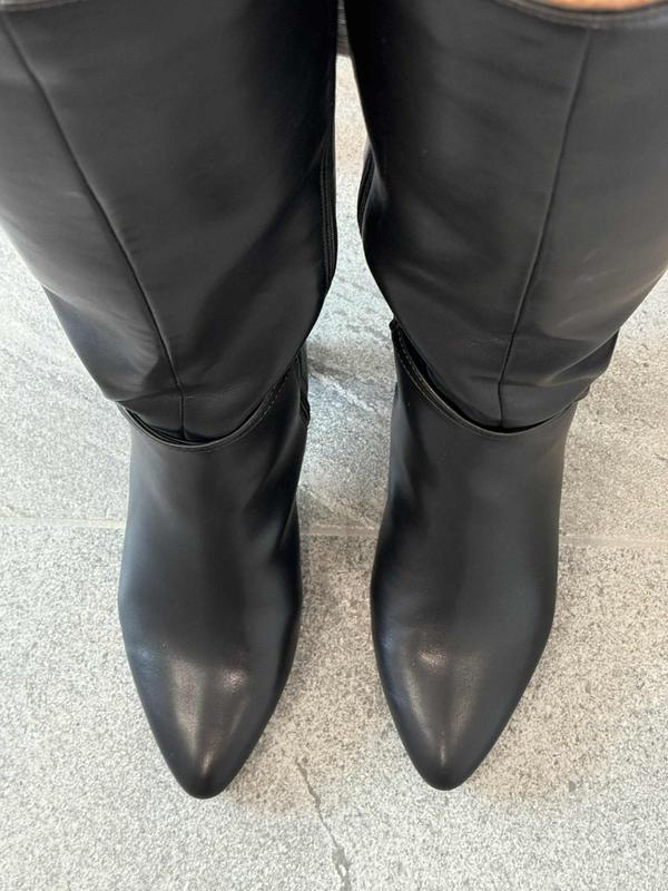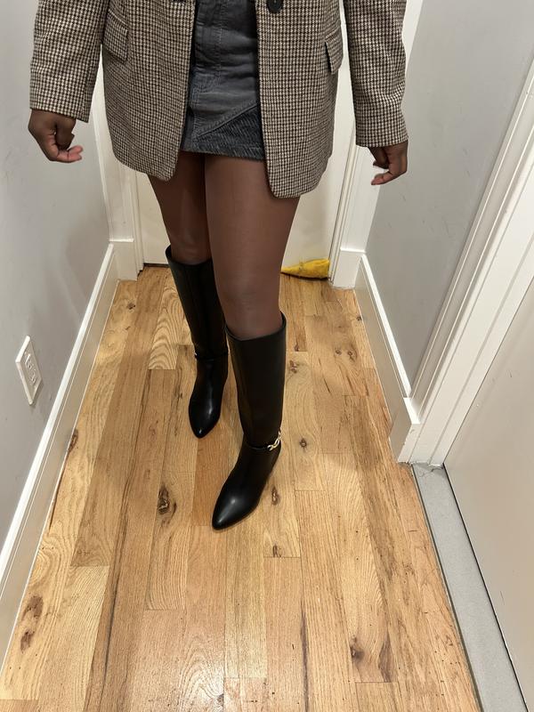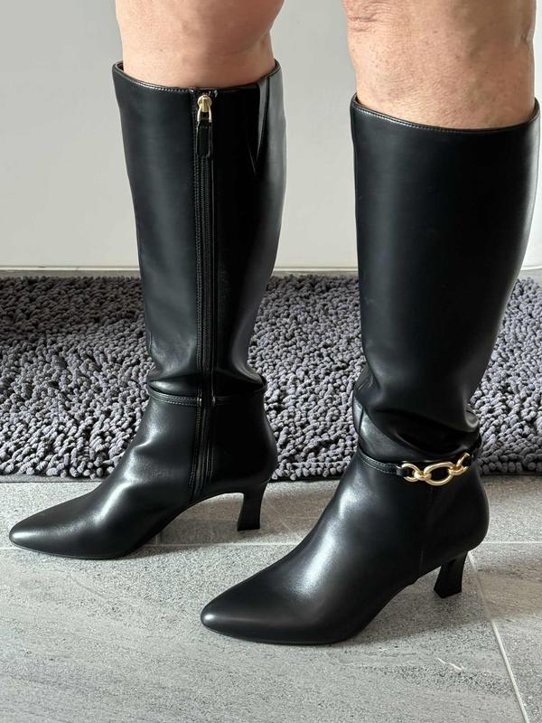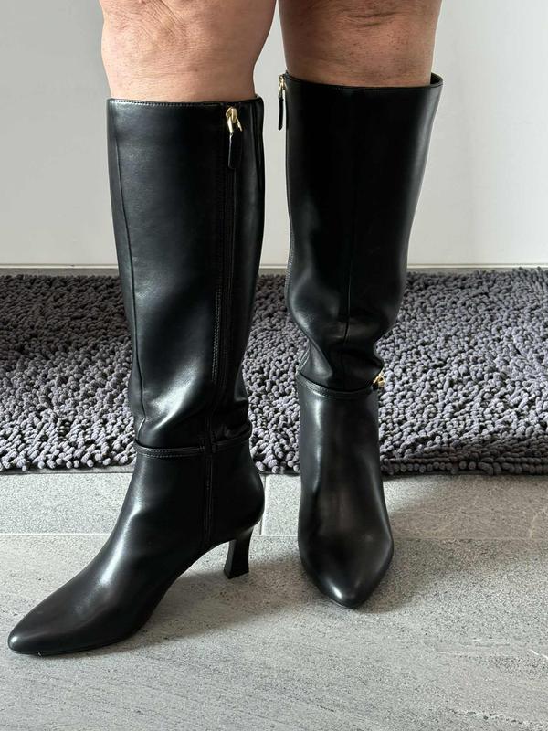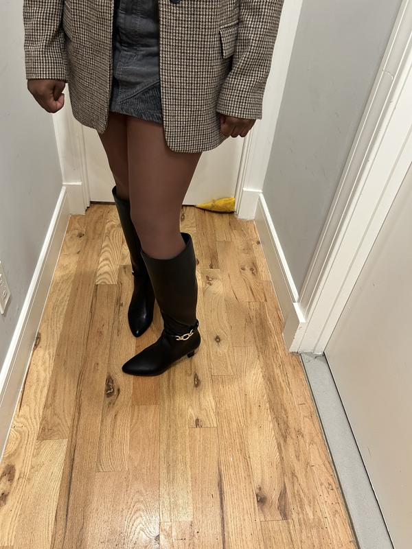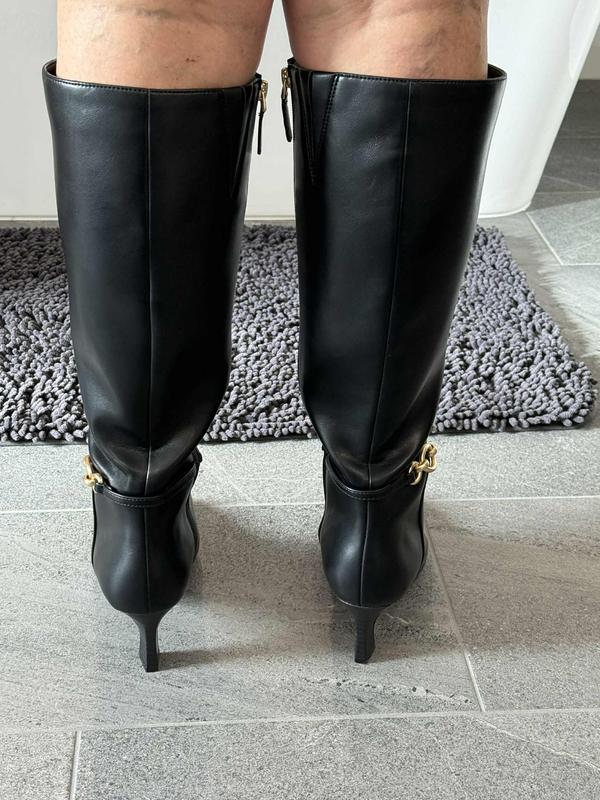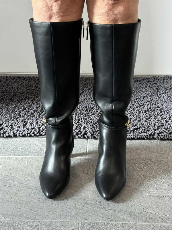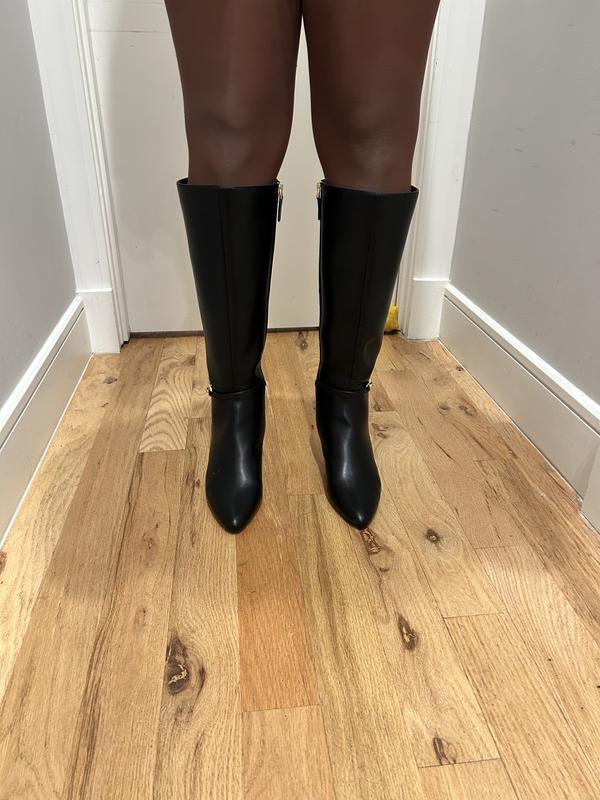 This is a beautiful tall dress boot. It has a pointed toe and two inch Stiletto like heel. It is man made material and has a classy gold embellishment towards the ankle. The boot is very comfortable. It feels as though the boot has a cushion insole and is true to size. I have average size calf’s and it fits perfectly. The style of the boot would appear as if the heel should have been taller especially with the stiletto type shape. This boot is definitely appropriate for dresses, skirts and even slacks.